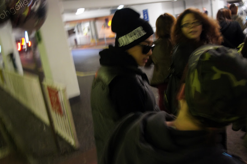 Mereka berjalan ke parkiran jadi kami mengikuti mereka. Pertama hanya TOP dan GD. GD sedikit melambaikan tangannya, lalu kami menyanyikan lagu ulangtahun untuk TOP dalam bahasa inggris, saya rasa dia tidak mengatakan apa2. Saya rasa mereka pergi dalam mobil terpisah karena saat saya kembali ke pintu masuk saya melihat Seungri keluar dengan manajernya, saya hanya melihat fan disana untuk 3 detik jadi saya dekat dengannya tapi dia menunduk lalu saya mengatakan seungri, oppa, dan dia melihat sedikit ke saya